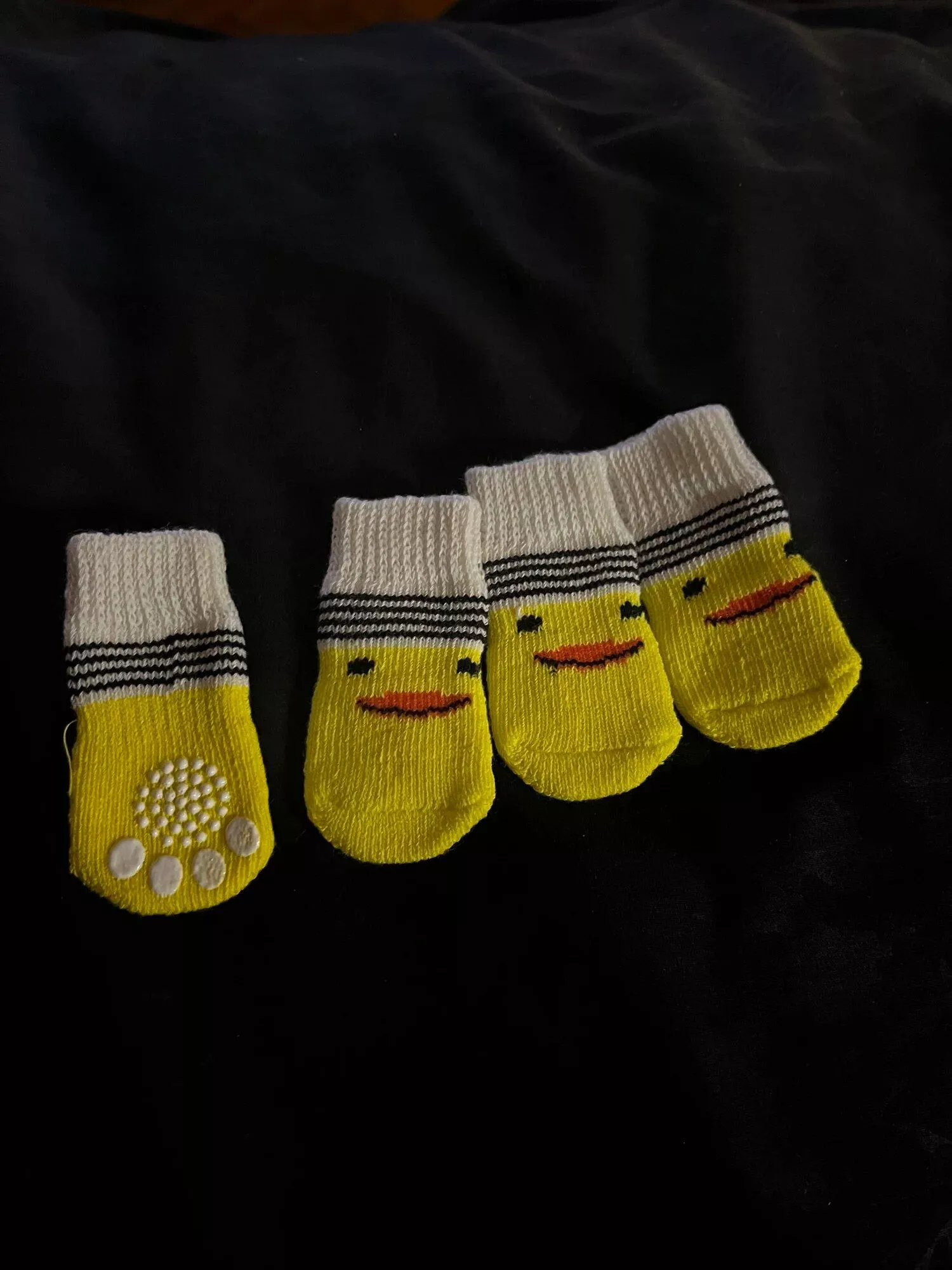 i recently bought these cute socks for my dog, and i'm thrilled with how well they work. they are not only adorable but also functional. my dog has a tendency to slip on our hardwood floors, but these socks have solved that problem completely. the grip on the bottom provides excellent traction, making it safer for them to run around the house. they are easy to put on and take off, and my dog doesn't seem to mind wearing them at all. the material is soft yet durable, perfect for everyday use. i've washed them several times, and they hold up well without losing their shape or color. they are also great for protecting my dog's paws during our walks. i highly recommend these socks to anyone looking for a cute and practical solution for their dog's paw protection.