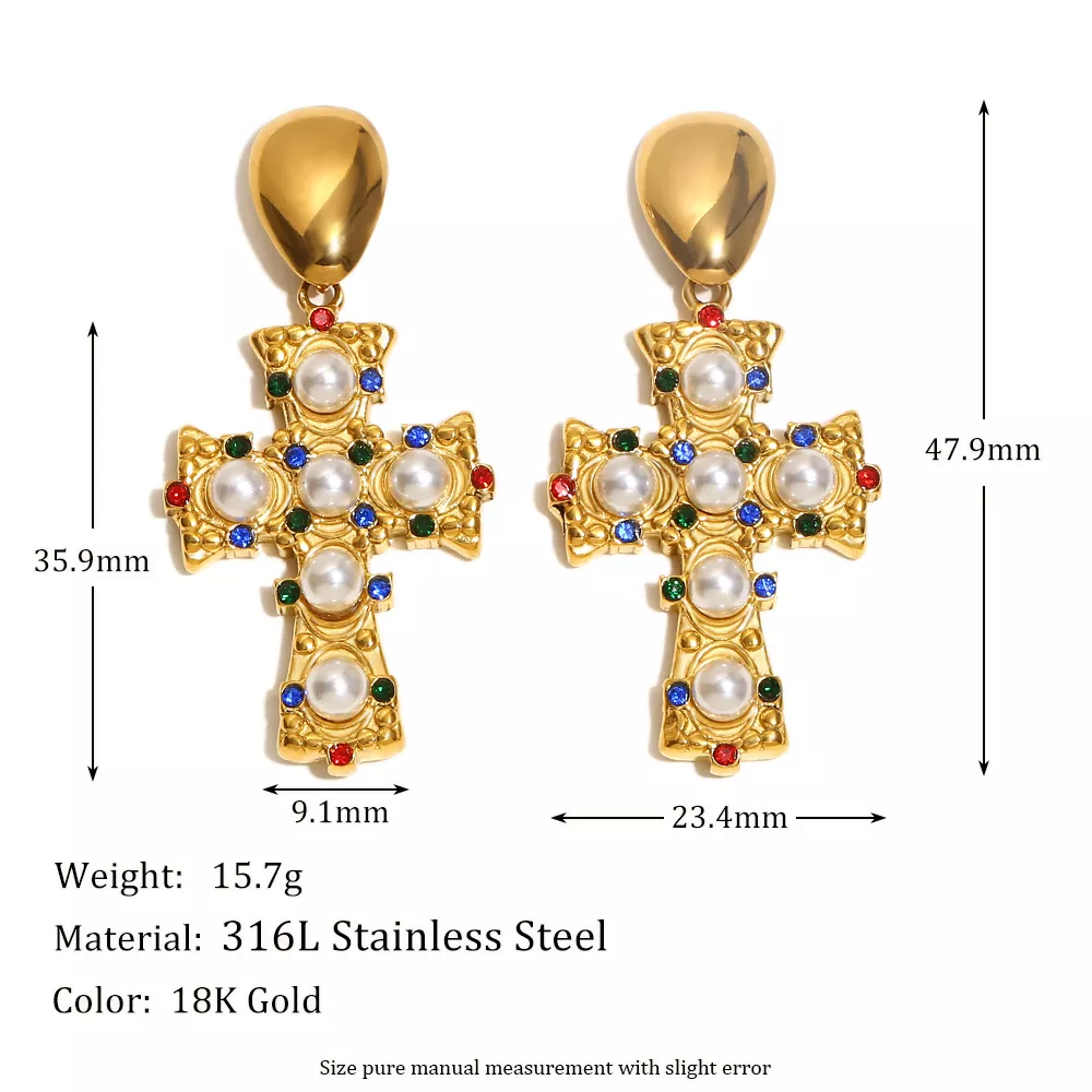Discover a stunning blend of vintage charm and modern craftsmanship with these exquisite Rhinestone Pearl Cross Pendant Earrings. Designed for the contemporary woman with a love for timeless accessories, these earrings are a must-have for adding a touch of sophistication to any outfit. The intricate design, featuring colorful rhinestones and pearls, is enhanced by the durable 18K gold-plated stainless steel construction, ensuring long-lasting brilliance and wearability.